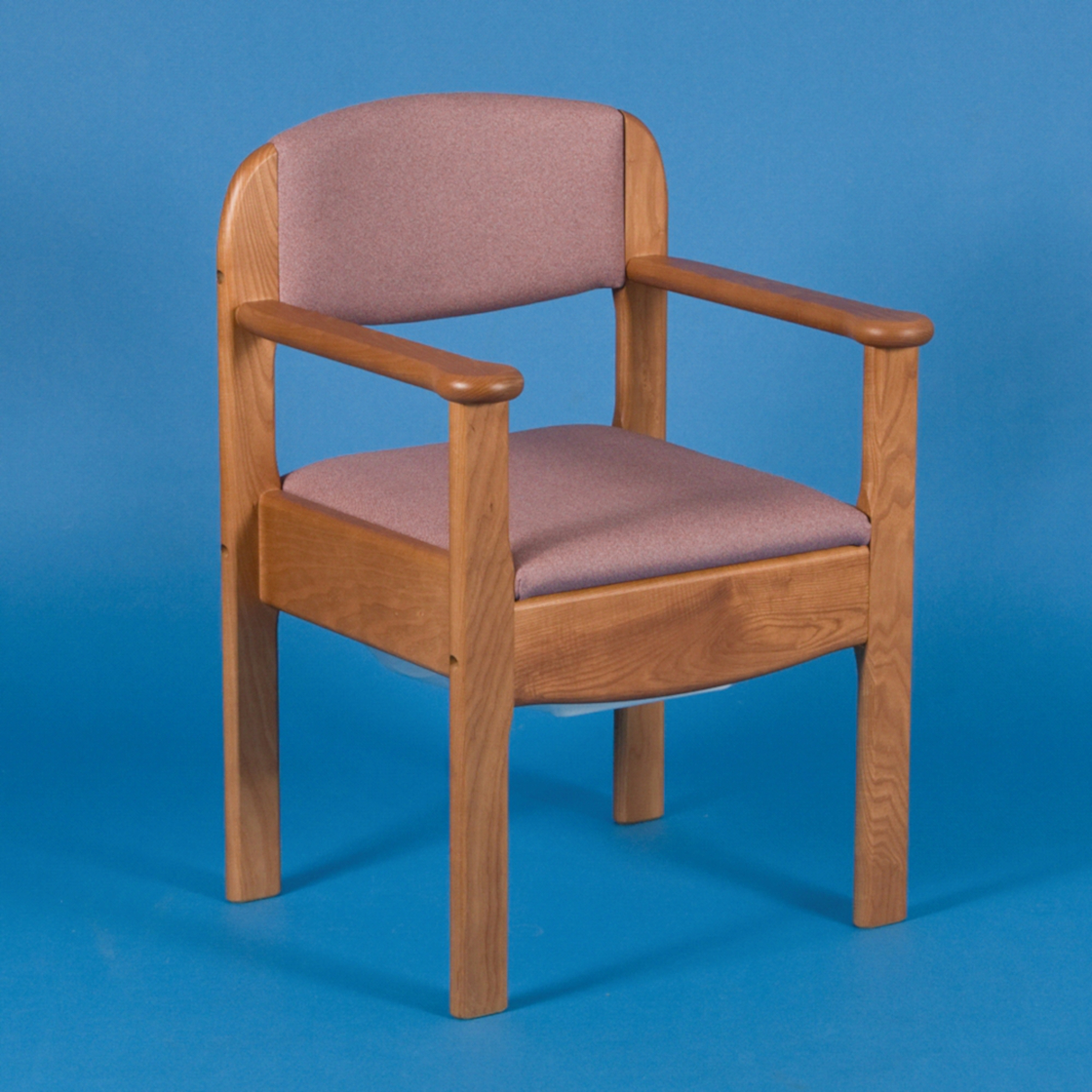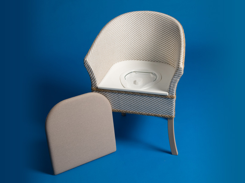 Cette chaise est équipée d’un seau auto-verrouillable intégré, totalement dissimulé sous un coussin d’assise confortable. Cela permet une utilisation quotidienne discrète tout en préservant le style du mobilier. Les accoudoirs hauts offrent un appui stable pour les mains et les avant-bras afin de faciliter le passage assis/debout.