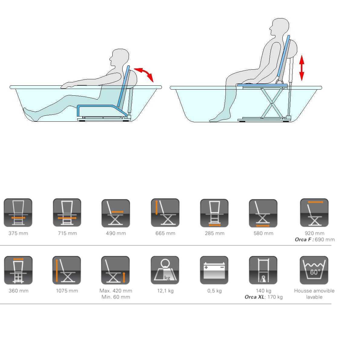 ✅ Caractéristiques de l’élévateur de bain Orca :