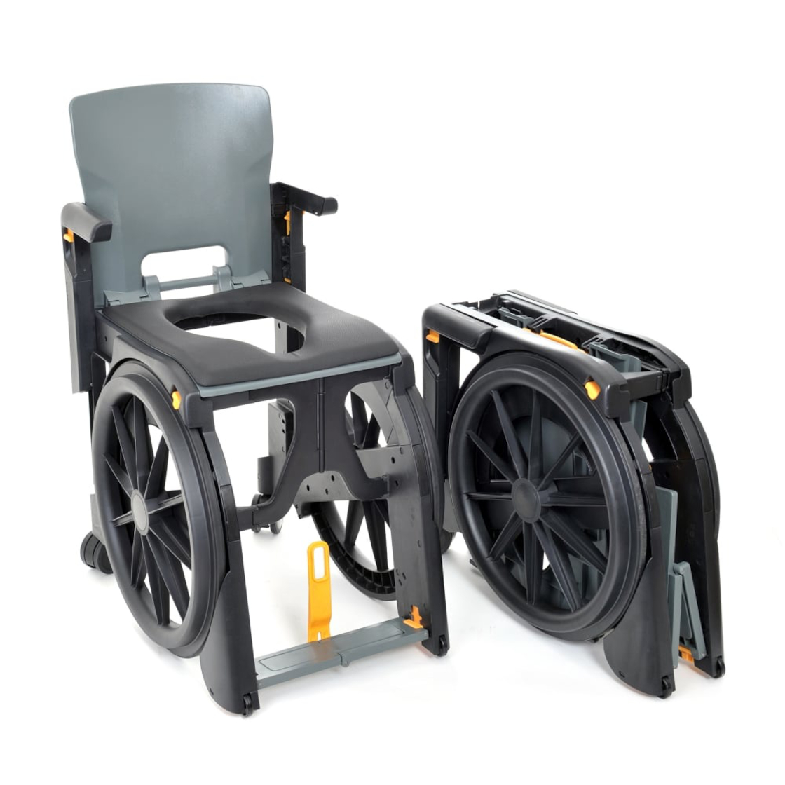 Son design pliable et compact permet à l’utilisateur de le monter et le démonter sans aide, à l’aide d’une seule main, directement depuis un autre fauteuil. Grâce à la position unique de ses roues sous l’assise, il peut reculer en toute facilité vers les toilettes, sans grand rayon de braquage, et sans encombrement.