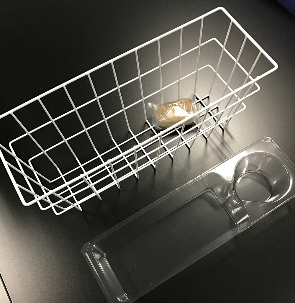 Ce panier est fabriqué en métal revêtu de vinyle, ce qui le rend à la fois solide et facile à nettoyer. De plus, son plateau en plastique thermoformé intégré au fond permet d’y déposer des objets sans risque de basculement. Un porte-gobelet intégré ajoute une touche de praticité supplémentaire.