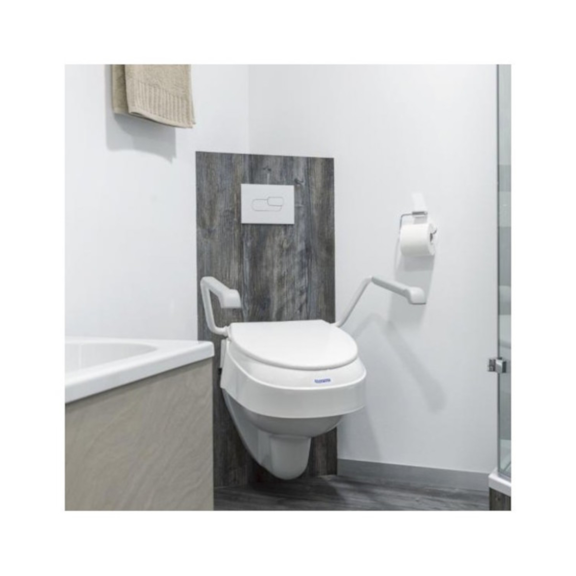 Il est équipé de deux accoudoirs latéraux relevables et démontables, permettant un transfert latéral facile et confortable. Ces accoudoirs offrent un soutien sécurisé tout en laissant de l’espace quand cela est nécessaire. Sa fixation par vis directement sur la cuvette garantit une excellente stabilité en usage quotidien.
